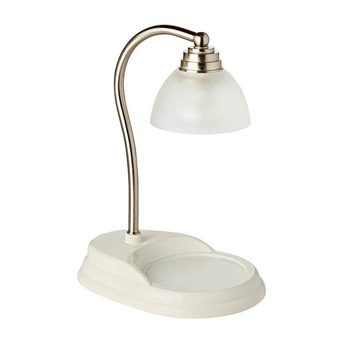 Candle Warmers Etc White Nickle Aurora Candle Lamp is inspired by mid-century desk lamps, with a classic curve and frosted glass shade. A traditional White lamp with a semi matte finish base and Pewter Silver stem, featuring our top down warming technology.